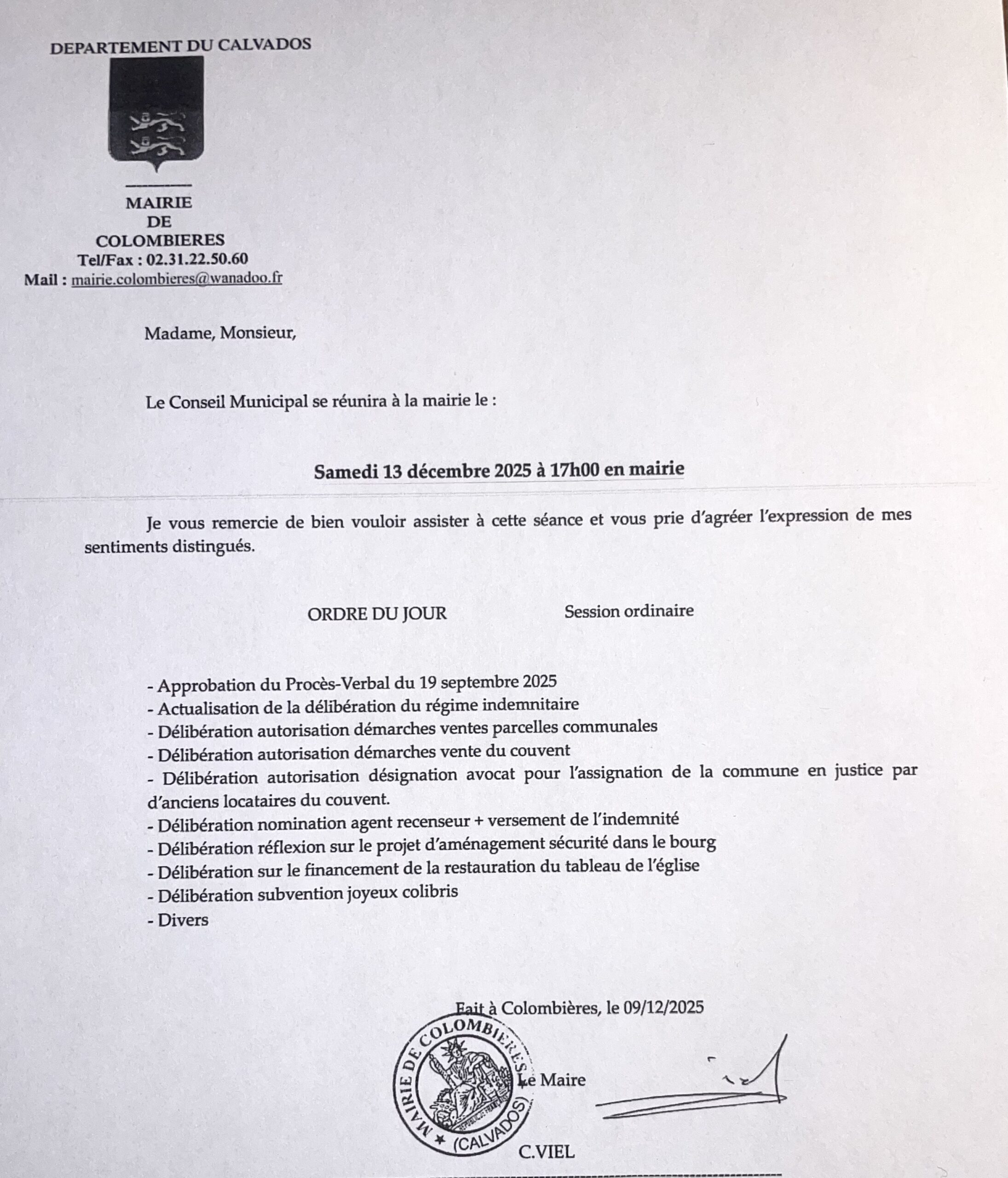 [MUNICIPALITÉ] – Samedi 13 décembre 2025 à 17h en mairie- Conseil Municipal.